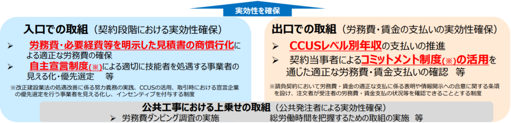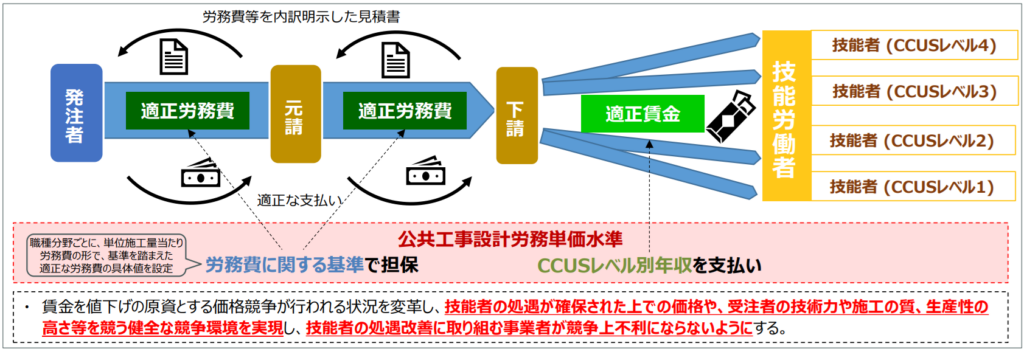 「労務費に関する基準」により、公共工事・民間工事を問わず、下請取引を含めて適正な労務費(賃金の原資)を確保するとともに、「CCUSレベル別年収」による、個々の技能者の経験・技能に応じた適正な賃金の支払いを目指す。