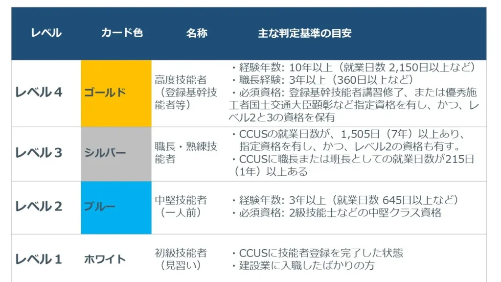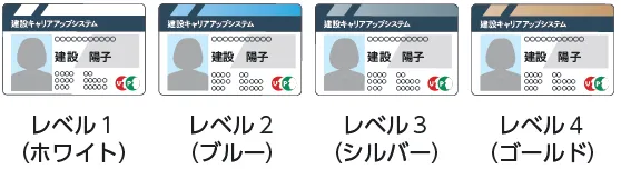 技能レベル評価制度は、CCUSに蓄積されたデータ(保有資格、就業日数、職長経験など)に基づき、技能者の能力を4段階で評価する仕組みです。評価結果はカードの色(ホワイト、ブルー、シルバー、ゴールド)で識別されます。