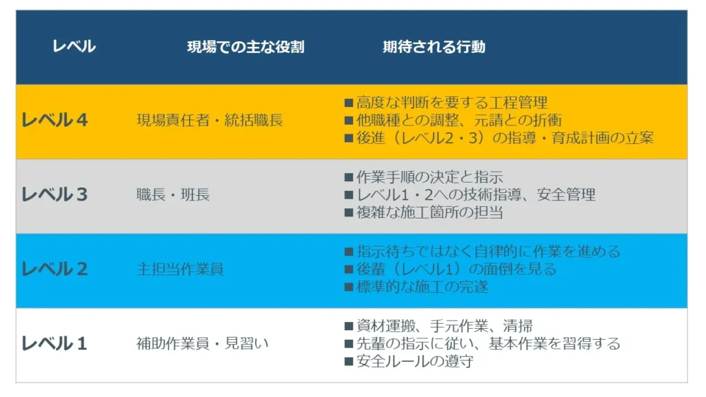 - 日当への上乗せ: 「レベル2になったら日当+500円」など、基本給のベースアップ基準にする。