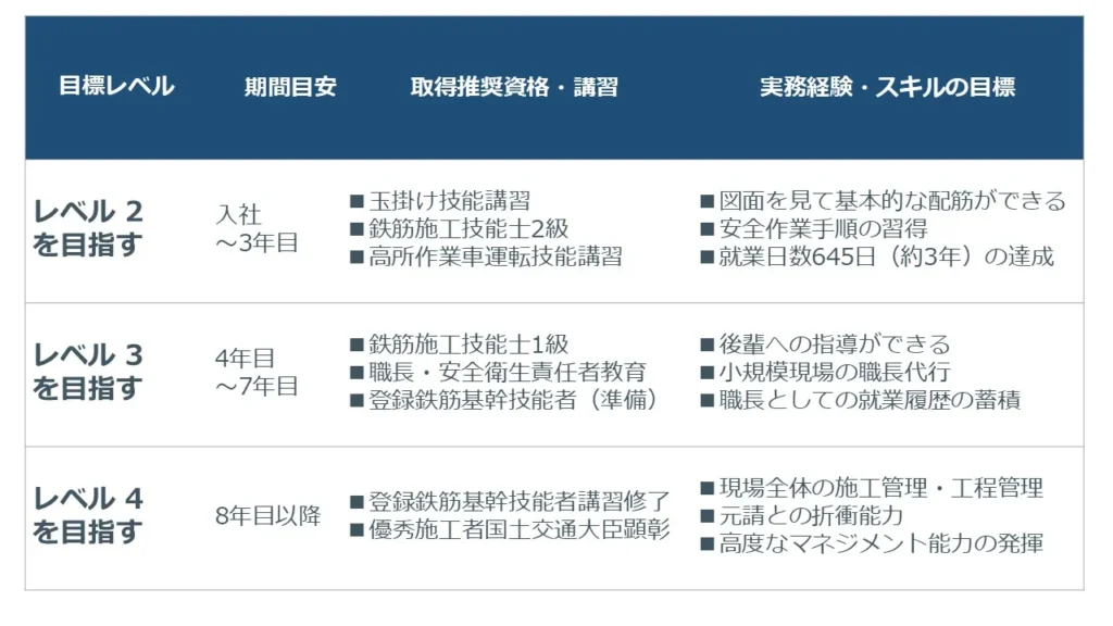 CCUSのレベル判定基準は、そのまま教育カリキュラムの骨子になります。漠然と「頑張れ」と言うのではなく、「レベル2になるために、あと〇日の経験と、この資格が必要だ」と具体的に示します。