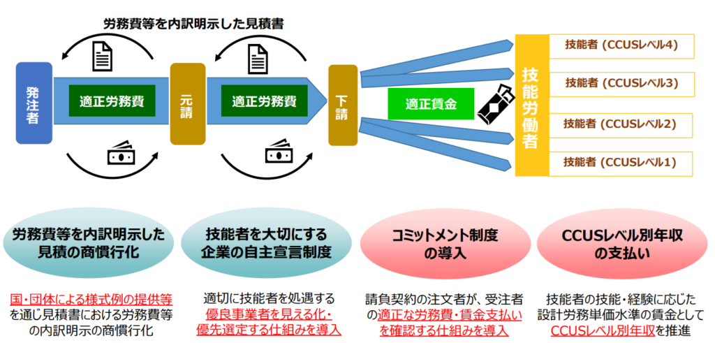 大きな柱としては、適正な賃金支払いの原資とすべき「労務費」を削ることなく下請まで行き渡らせることと、技能者の能力や経験に応じてお給料を上げられるようにする仕組みを作ることにあります。