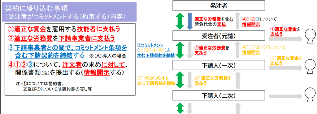 特に、発注者から元請、元請から下請へと適正な労務費を確保し、最終的に現場で働く技能者に適正な賃金を行き渡らせるためには、「やると言ったことを本当にやる」ための仕組みが不可欠です。コミットメント条項は、その実効性を担保するための重要な制度と位置づけられています。