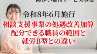令和8年6月から新設される相談支援事業の処遇改善加算について、配分できる職員の範囲と配分ルールを詳しく解説。就労継続支援B型の処遇改善加算との違いを比較表で整理し、事業者が実務で迷いやすいポイントをわかりやすく解説します。