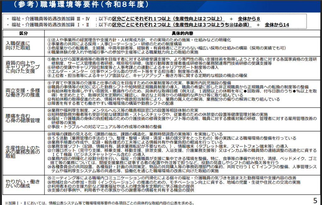 職員が働きやすい環境を整える「職場環境等要件」の必要項目数が増加します。