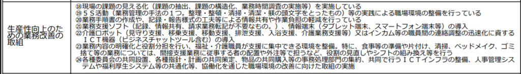 項目数が増えています(加算Ⅰなら14項目)。「5S活動(整理整頓)」「マニュアル作成」「定期的なミーティング」など、コストをかけずにできることから確実に選びましょう。