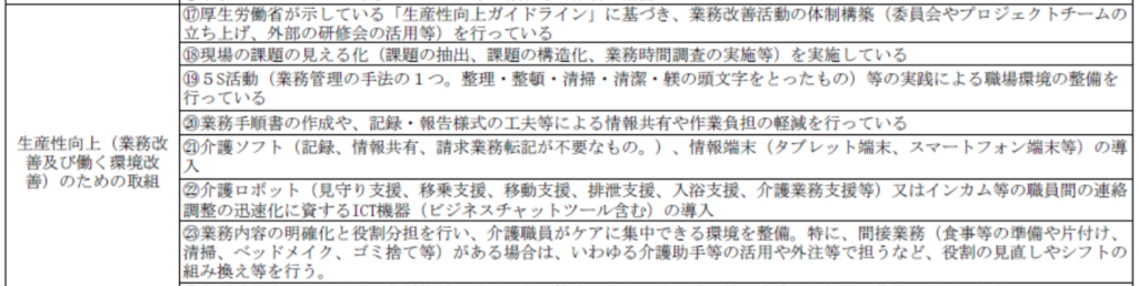 加算Ⅲ・Ⅳを算定する事業所については、職場環境等要件の取組数の引き上げ(全体から8項目以上、うち生産性向上関係は2項目以上)が課されます。キャリアパス要件Ⅰ〜Ⅲ自体に構造的な変更はありません。